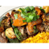 Gegrillte Spieße mit frischem Gemüse der Saison, serviert mit persischem Safranreis